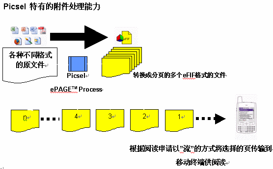 在計算機上的電子郵件的各種格式文件附件無需任何特殊處理、無需同步和轉(zhuǎn)換可以在移動終端上閱讀。并且電子郵件的附件可以被進一步壓縮使其通過網(wǎng)絡下載更為經(jīng)濟,壓縮后服務器將文件以"流"傳送,這意味著用戶無需等待一個多頁的文件完全下載完畢后再閱讀,可以選擇任何一頁下載閱讀。