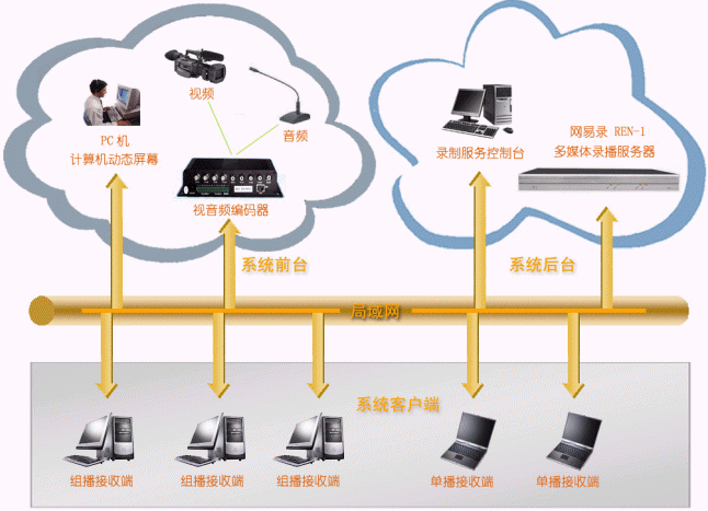 - 系統(tǒng)后臺:連接在網(wǎng)絡(luò)上即可,接受REN-1服務(wù)器管理端發(fā)送來的系統(tǒng)管理、維護指令,并負責將系統(tǒng)前臺發(fā)送來的視頻、音頻、計算機動態(tài)屏幕進行實時錄制和直播,它包括:網(wǎng)易錄媒體中心(REN-1),它為系統(tǒng)的核心,主要完成視頻、音頻、計算機動態(tài)屏幕的錄制和直播;