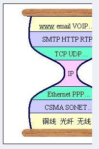 RFC1958和RFC3724等所描述的“端到端的透明性”是Internet一直堅持的為數(shù)不多的Internet體系架構(gòu)的核心設(shè)計理念。所謂端到端的透明性,就是在TCP/IP的設(shè)計中,將Internet系統(tǒng)中與通信相關(guān)的部分(IP網(wǎng)絡(luò))與高層應(yīng)用(端點)分離,最大限度地簡化網(wǎng)絡(luò)的設(shè)計。在有些文獻中也稱其為“沙漏”模型,如圖1。