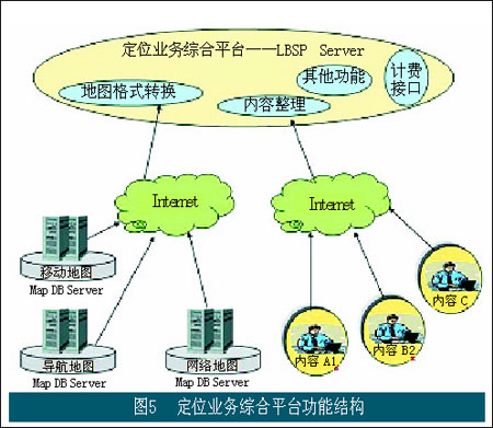 在上述結(jié)構(gòu)中,定位業(yè)務(wù)綜合平臺LBSP扮演著重要角色。其功能結(jié)構(gòu)如圖5所示。在該平臺中提供位置類信息業(yè)務(wù)的業(yè)務(wù)運(yùn)營支撐功能,包括計(jì)費(fèi)功能(以及和BOSS系統(tǒng)的接口);同時該平臺還扮演著接入不同內(nèi)容開發(fā)商的重要角色。不同的內(nèi)容開發(fā)和提供商通過該平臺向最終用戶提供具體的業(yè)務(wù)和應(yīng)用,運(yùn)營商通過該平臺對不同內(nèi)容開發(fā)商提供的內(nèi)容進(jìn)行管理和整理,使面向用戶的應(yīng)用能夠順利得到展現(xiàn)。該平臺提供的另一個重要角色是肩負(fù)著接入地圖信息提供商的重任,并在該平臺中通過地圖格式的轉(zhuǎn)換使不同地圖提供商所提供的地圖信息能夠以一致的格式向用戶提供。