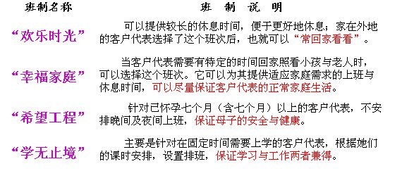 通過流程優(yōu)化,可以大大提高組織的運(yùn)營效率和工作質(zhì)量,如:我們通過對員工排班流程的優(yōu)化,大大提高了客戶服務(wù)中心人員的利用效率、服務(wù)質(zhì)量,同時,還提高了員工滿意度。我們通過對流程中第3、4、5步工作方法的改進(jìn),大大提高了人員利用率,且提高幅度達(dá)20%以上。同樣,通過對第6步班次設(shè)置的改進(jìn),實(shí)施了個性化的班次設(shè)置(見表2),如:針對喜歡有整天休息時間,及家在外地的客戶代表,設(shè)置了“歡樂時光”輪班,為大家提供較長的休息時間,如兩天以上的連休,便于回家與更好地休息;針對家里有小孩子或老人、需在固定時間回家的客戶代表,設(shè)置了“幸福家庭”輪班,為他們提供適應(yīng)家庭需求的上班與休息時間,盡量保證員工的正常家庭生活;針對已懷孕及哺乳期的客戶代表,設(shè)置了“希望工程”輪班,不安排晚間及夜間上班,保證了母子的安全與健康;針對在固定時間需要上學(xué)的客戶代表,設(shè)置了“學(xué)無止境”輪班,主要是根據(jù)她們的課時安排設(shè)置排班,保證學(xué)習(xí)與工作兩者兼得。這種做法大大加強(qiáng)了員工積極性,并提高了員工的滿意度。