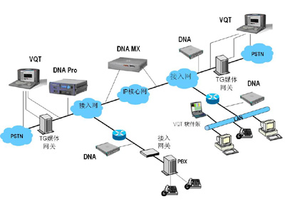 以上兩種測試方法也可以結(jié)合使用,在進(jìn)行端到端VQT測試時(shí),在NGN網(wǎng)絡(luò)的中間網(wǎng)段(根據(jù)需要可以設(shè)置多個(gè)監(jiān)測點(diǎn))部署分布式網(wǎng)絡(luò)分析儀(DNA),進(jìn)行被動(dòng)式RTP/RTCP監(jiān)測,從而判斷出造成語音質(zhì)量下降的環(huán)節(jié)所在。如下圖所示: