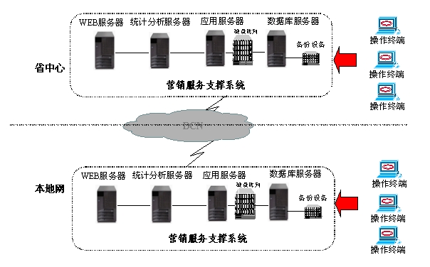 省中心/分公司營(yíng)銷服務(wù)支撐系統(tǒng)由兩臺(tái)IBM服務(wù)器形成雙機(jī)集群,同時(shí)安裝有數(shù)據(jù)庫(kù)服務(wù)器、WEB服務(wù)器、應(yīng)用服務(wù)器、統(tǒng)計(jì)分析服務(wù)器。