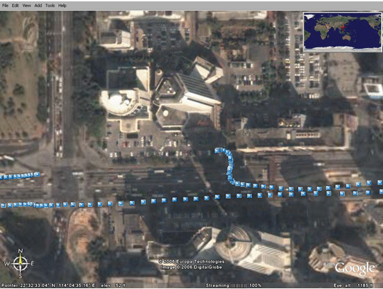 下圖顯示的是在中國深圳市進(jìn)行汽車試駕時的GPS數(shù)據(jù),利用的是Google earth應(yīng)用程序。圖中的每一個藍(lán)點代表一個GPS讀數(shù)。這些點在每隔一秒的時間內(nèi)讀出,因此,連續(xù)點之間的距離就代表著汽車的速度。我們甚至可以看見汽車駛?cè)氪髽堑耐\噲觥?br />