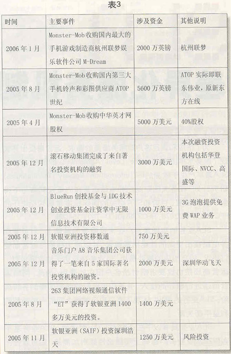 近幾年來,一些資本投資商將投資的重點放到了無線音樂、手機游戲和手機視訊等業(yè)務(wù)領(lǐng)域,逐步加大了對SP的投資力度(見表3)。進入2005年以來,著眼于2.5G向3G的全面演進,風(fēng)險投資對SP的投資力度進一步加大。以滾石移動為例,在2002年和2004年獲得兩輪風(fēng)險投資之后,滾石移動憑借在無線音樂領(lǐng)域取得的良好市場業(yè)績,又獲得了智基創(chuàng)投、華登國際、聯(lián)想投資等公司的投資,投資金額達3000萬美元。繼2004年10月獲得IDG投資以后,2005年12月7日,國內(nèi)著名的數(shù)字音樂門戶——A8音樂集團獲得了包括IDG和Intel投資公司在內(nèi)的5家國際著名投資機構(gòu)的投資,投資金額達2000萬美元。同月,掌中無限則獲得了來自全球性風(fēng)險投資商BlueRun創(chuàng)投基金和IDG總額達上千萬美元的投資。