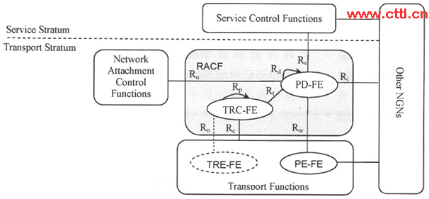 RACF由策略決策功能實(shí)體PD-FE和傳送資源控制功能TRC-FE兩個(gè)功能實(shí)體組成。PD-FE基于網(wǎng)絡(luò)策略規(guī)則、業(yè)務(wù)控制功能SCF提供的業(yè)務(wù)信息、網(wǎng)絡(luò)附著控制功能NACF提供的傳送層簽約信息,以及TRC-FE提供的資源接納決策結(jié)果,做出網(wǎng)絡(luò)資源接納控制的最后決策?梢曰诿總(gè)流對(duì)傳送層的策略執(zhí)行功能實(shí)體。PE-FE下發(fā)資源接納控制策略。TRC-FE負(fù)責(zé)收集和維護(hù)傳送網(wǎng)的拓?fù)浜唾Y源狀態(tài)信息,基于拓?fù)、連接性、網(wǎng)絡(luò)、節(jié)點(diǎn)資源的可用性以及接入網(wǎng)中的傳送層簽約信息等網(wǎng)絡(luò)信息控制資源的使用,提供傳送網(wǎng)絡(luò)接納控制的決策。PD-FE通過Rt參考點(diǎn)請(qǐng)求TRC-FE檢測或者決定所請(qǐng)求的媒體流路徑上的QoS資源。
