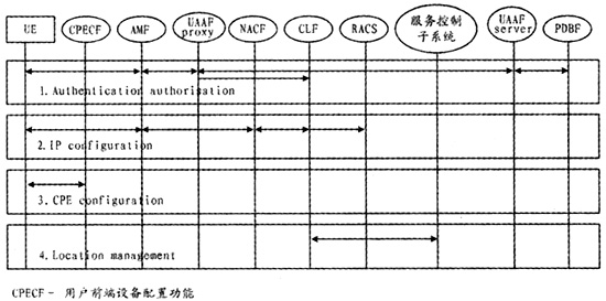 AMF負(fù)責(zé)翻譯UE的接入請(qǐng)求,將UE的IP地址分配請(qǐng)求以及網(wǎng)絡(luò)配置參數(shù)請(qǐng)求轉(zhuǎn)發(fā)至NACF,將用戶(hù)鑒權(quán)請(qǐng)求轉(zhuǎn)發(fā)給用戶(hù)接入鑒權(quán)功能(UAAF),反向則將來(lái)自NACF或UAAF的響應(yīng)轉(zhuǎn)發(fā)給UE。