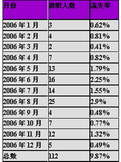 在進(jìn)行收集、分析一些客服中心資料的過程中,與相關(guān)領(lǐng)導(dǎo)人員進(jìn)行較深入的思想碰撞,尤其是與中國(guó)移動(dòng)江蘇省客服中心副總經(jīng)理張立春的交流,尤為深刻。一組數(shù)據(jù)深深的震撼著我的思想,一是離職率2006年,僅為:9.87%,遠(yuǎn)遠(yuǎn)好于整個(gè)行業(yè)的平均水平;二是員工的心理健康和壓力狀況遠(yuǎn)遠(yuǎn)好于全國(guó)的平均水平;三是客戶服務(wù)質(zhì)量保持行業(yè)領(lǐng)先地位,各項(xiàng)指標(biāo)具體數(shù)值陳述如下。