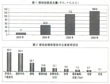 日本的在線購物和拍賣市場起步較晚,但發(fā)展速度較快,用戶的認(rèn)知度也比較高,有41%~48%的移動互聯(lián)網(wǎng)用戶使用過該項(xiàng)業(yè)務(wù)。十幾歲到二十幾歲的女性較傾向于使用該業(yè)務(wù)。2006年移動拍賣的成交量為1295億日元,占到了通過手機(jī)在線購買成交量的1/2(見圖1)。