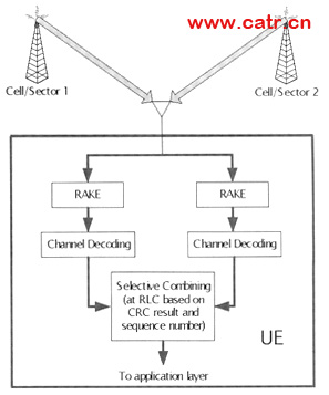 當(dāng)終端用戶移動(dòng)到不同基站下的小區(qū)分界處時(shí)候,采用宏分集技術(shù)同時(shí)接收來(lái)自兩個(gè)基站的電視數(shù)據(jù)(見(jiàn)圖3)。在實(shí)現(xiàn)宏分集技術(shù)時(shí),要求網(wǎng)絡(luò)側(cè)針對(duì)同一MBMS業(yè)務(wù)在兩小區(qū)間進(jìn)行內(nèi)容同步和一定程度上的時(shí)間同步。