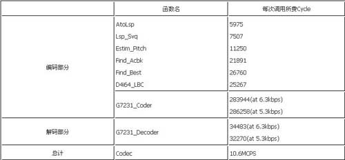 經(jīng)過C語言級和匯編級的多種優(yōu)化,最后實(shí)現(xiàn)了一路G.723.1的編解碼需要花費(fèi)10.6MCPS,整個(gè)代碼的程序空間為208K byte(程序中包括了部分c6201的庫函數(shù)),數(shù)據(jù)空間為8K byte,碼本大小20k byte,多通道的上下文數(shù)據(jù)為1.48K byte。200MHz的C6201每秒可以實(shí)時(shí)編解碼16路語音信號。所有代碼全部通過了ITU-T測試矢量的測試。表1是各主要模塊的運(yùn)算量。
