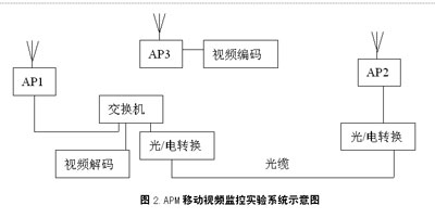 為了保證APM移動(dòng)視頻監(jiān)控系統(tǒng)的整體性能,筆者就APM系統(tǒng)無(wú)線(xiàn)網(wǎng)絡(luò)和視頻編碼器的各自性能,進(jìn)行了實(shí)驗(yàn)。本次實(shí)驗(yàn)采用兩個(gè)步驟,即實(shí)驗(yàn)室測(cè)試和現(xiàn)場(chǎng)模擬實(shí)驗(yàn)測(cè)試,并在實(shí)驗(yàn)室測(cè)試的基礎(chǔ)上,對(duì)無(wú)線(xiàn)網(wǎng)絡(luò)和視頻編碼器間的初步配合進(jìn)行現(xiàn)場(chǎng)實(shí)驗(yàn)測(cè)試,F(xiàn)場(chǎng)的實(shí)驗(yàn)系統(tǒng)組成如圖2所示。