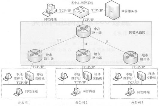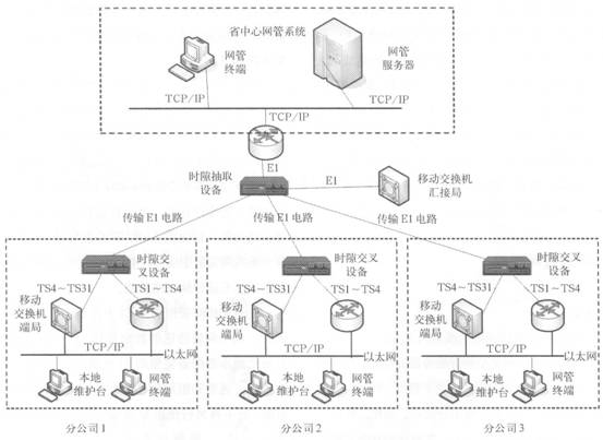 同樣以移動網(wǎng)為例,例子中移動交換機到維護終端支持TCP/IP方式,分公司具有本地維護終端和網(wǎng)管終端兩種類型的維護臺。本地維護終端通過以太交換機直接與移動交換機相連;網(wǎng)元和網(wǎng)管終端通過以太網(wǎng)接入邊緣路由器,經路由器接.el轉化以El方式接入到時隙抽取設備中,由于傳送網(wǎng)管信息占用帶寬較小,