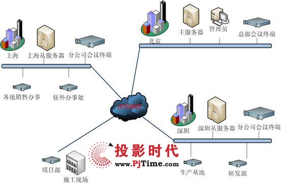 3臺高端專用服務器作為視頻會議服務器,可容納多點同時開會,以確保系統(tǒng)的穩(wěn)定性和性能要求。主服務器放置在總公司,從服務器共2個,分別放置在輻射分公司面大,位于分公司中心的兩個城市。所有接入的服務器和客戶端采用同一網(wǎng)絡服務商的線路。配置了使用1000M服務器專用網(wǎng)卡,以保證正常的音視頻信號的傳輸。并且將服務器放置在主干/核心交換機上,使服務器和客戶端的路由/交換性能達到最佳效果。其網(wǎng)絡拓撲圖如下: