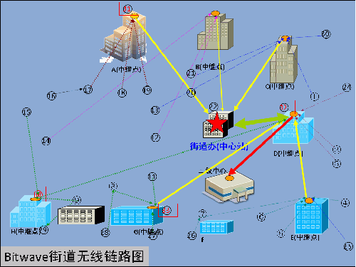 例如,遠(yuǎn)端地面點(diǎn)與主控中心有樓房、樹(shù)木等障礙物遮擋,Bitwave采用中繼的模式,在遠(yuǎn)端地面點(diǎn)和中心點(diǎn)都可視的高點(diǎn)建筑物上架設(shè)一收一發(fā)的兩臺(tái)BWB210無(wú)線(xiàn)網(wǎng)橋,通過(guò)功分器或交換機(jī)將遠(yuǎn)端點(diǎn)的信號(hào)傳送到中心點(diǎn),很好的解決了遠(yuǎn)端點(diǎn)與中心點(diǎn)不可視情況下鏈路無(wú)法搭建的問(wèn)題。