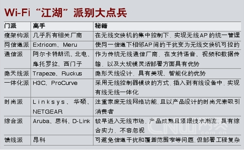 少林、武當、華山、峨嵋、丐幫……眾多門派共同支撐起了武俠小說當中的“江湖”。而在無線網(wǎng)絡(luò)的“江湖”上,其實也存在著很多門派:比如瘦架構(gòu)派、同信道派、一體化派、通信派、隱天線派、時尚派等,各家廠商都有自己的看家本事,在極大豐富了無線產(chǎn)品,更好滿足了用戶需求的同時,也促進了無線技術(shù)在多個層面上的深入發(fā)展。