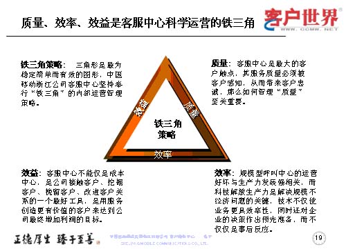應(yīng)該說這三個(gè)方面是科學(xué)運(yùn)營的一個(gè)鐵三角,這是我們的理解,因?yàn)槿切,始終認(rèn)為是最穩(wěn)定、簡單、有效的圖形,也是我們在進(jìn)行內(nèi)部運(yùn)營的管理鐵架。質(zhì)量是客服中心最大的觸點(diǎn)當(dāng)中被客戶感知,從而帶來客戶忠誠的,如何管理質(zhì)量,那就至關(guān)重要。效率尤其是規(guī)模型的呼叫中心的運(yùn)營好壞,是與生產(chǎn)力的發(fā)展強(qiáng)相關(guān),而科技解放生產(chǎn)力是解決規(guī)模問題的關(guān)鍵。技術(shù)不僅是運(yùn)行更具效益率,同時(shí)還對企業(yè)的決策作出預(yù)先準(zhǔn)備,而不僅僅是事后反應(yīng)。很多年來,更多的企業(yè)是把客服中心視為成本中心,而事實(shí)上,效益的顯現(xiàn)讓我們陸續(xù)地走出了成本中心,它應(yīng)該是公司接觸客戶、挖掘客戶、挽留客戶、改進(jìn)客戶關(guān)系的一個(gè)最好工具,是用服務(wù)創(chuàng)造更有價(jià)值的客戶,來達(dá)到公司最終增加利潤的目標(biāo)。
