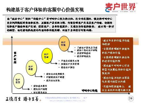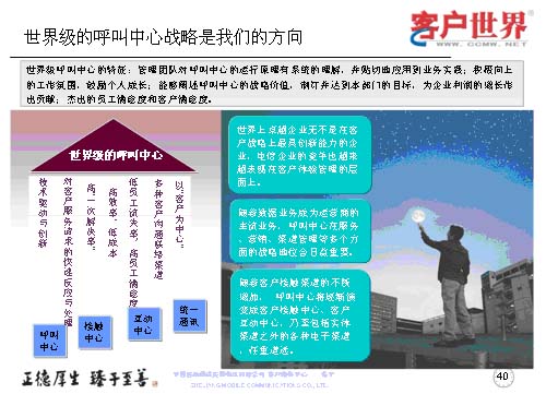 最后我想世界級的呼叫中心戰(zhàn)略是我們從事客戶服務(wù)行業(yè),從事呼叫中心人的方向,從我們理解的世界級呼叫中心特征來講,管理團(tuán)隊(duì)?wèi)?yīng)對呼叫中心的運(yùn)營原理有系統(tǒng)的理解,并貼切地應(yīng)用到業(yè)務(wù)實(shí)踐,創(chuàng)造積極向上的工作氛圍,鼓勵(lì)員工成長,能夠闡述呼叫中心的戰(zhàn)略價(jià)值,制訂并達(dá)到本部門的目標(biāo),為企業(yè)利潤的增長作出杰出的貢獻(xiàn),杰出的員工滿意度和客戶滿意度。所以世界級呼叫中心我們理解是從七個(gè)方面來衡量,以“客戶為中心”,多種客戶溝通的聯(lián)絡(luò)渠道,低員工流失率和高客戶滿意度,高效率、低成本,高“一次性解決率”,對客戶服務(wù)請求的快速反應(yīng)與處理,技術(shù)驅(qū)動(dòng)與創(chuàng)新。