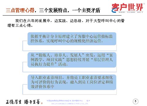 在這六年中,我們有三點(diǎn)管理心得,三個(gè)發(fā)展特點(diǎn),一個(gè)主要矛盾。我們邊實(shí)踐邊總結(jié),對大型呼叫中心運(yùn)營的管理有三點(diǎn)心得: