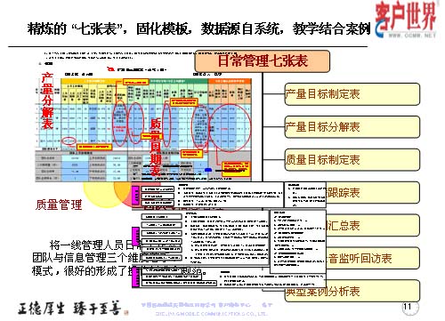 我們精煉了這么七張表的方式,運(yùn)用三個(gè)維度:產(chǎn)量管理、質(zhì)量管理和團(tuán)隊(duì)與信息管理,而這些基礎(chǔ)數(shù)據(jù)都來自于系統(tǒng),教學(xué)和案例。而七張表是從產(chǎn)量、質(zhì)量和團(tuán)隊(duì)信息來展現(xiàn)出具體的一些應(yīng)用,將一線管理人員從日常工作的三個(gè)維度入手,形成七張表管理模式,很好地具備了操作標(biāo)準(zhǔn)和規(guī)范。這模板表除了系統(tǒng)出來的一些數(shù)據(jù)以外,通過我們基層管理人員的項(xiàng)目執(zhí)行和跟蹤檢查,形成一些案例,改進(jìn)計(jì)劃和改進(jìn)意見。這幾張表多為系統(tǒng)自身所產(chǎn)生一些具體的數(shù)據(jù),比如說上個(gè)月的指標(biāo)值如何設(shè)定,實(shí)際達(dá)成的產(chǎn)量怎樣,回訪滿意率具體有哪些數(shù)據(jù),都在客服系統(tǒng)的報(bào)表中提煉出來的相關(guān)數(shù)據(jù)。