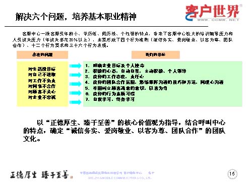 一線客服人員如何來全面提升職業(yè)能力,首先是解決一線客服人員的六個(gè)問題,剛才已經(jīng)跟大家交流了客服中心一線人員的人員結(jié)構(gòu),當(dāng)前的六個(gè)主要問題可以用簡單的幾個(gè)方面來表述:對生活沒有明確的目標(biāo)、對自己不進(jìn)取、對工作不負(fù)責(zé)、對同事不合作、對顧客不關(guān)心、對企業(yè)不忠誠,這是在日常工作中,一線人員所存在的問題。而針對這些問題,我們要用工作目標(biāo)去持續(xù)解決和克服問題,所以我們采取的是讓大家明確企業(yè)目標(biāo)與個(gè)人使命,用積極的心態(tài)自主自發(fā),主動(dòng)積極和個(gè)人領(lǐng)導(dǎo);良好的工作態(tài)度責(zé)任心,良好的團(tuán)隊(duì)合作氛圍;熟練掌握溝通技巧和方法,牢固樹立顧客滿意的意識,以客為尊;良好的行為素質(zhì)習(xí)慣,自我學(xué)習(xí),終身學(xué)習(xí)。從而在中國移動(dòng)集團(tuán)“正德厚生、臻于至善”的核心價(jià)值觀指導(dǎo)下,結(jié)合呼叫中心特點(diǎn),確定誠實(shí)務(wù)信,愛崗敬業(yè),以客為尊、團(tuán)隊(duì)合作的團(tuán)隊(duì)文化。