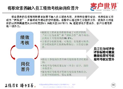 職業(yè)素養(yǎng)不是說在嘴上,講在課上,而是更多地融入到員工的績效考核于崗位晉升當(dāng)中。以解決工作素養(yǎng)要求和實(shí)際工作的兩張皮,以及使得客服理念成為理論的空中樓閣。所以我們是持之以恒地開展一線員工組織認(rèn)同滿意度調(diào)查,我們每年都會做一線客服人員的滿意度調(diào)查,在滿意度調(diào)查當(dāng)中,從05年的69.3%,提升到07年的73.9%,而且遙遙領(lǐng)先于營業(yè)員和客服經(jīng)理。而在績效考核中主要把員工行為素質(zhì)、團(tuán)隊(duì)合作占到了員工月度績效的16.5%,使大家認(rèn)識到作為一個(gè)組織中的一員,作為團(tuán)隊(duì)我們是為了一個(gè)共同的目標(biāo),彼此依賴、彼此信任,同時(shí)也要強(qiáng)化績效來管理。所以主要的評分依據(jù)是客觀、可衡量、有依據(jù)可查,同時(shí)也把這些也作為客服人員季度晉升和月度績效考評掛鉤,如果該員工季度的平均考核在良好以下的話,將得不到晉升,最終實(shí)現(xiàn)的是員工行為可評價(jià),評價(jià)標(biāo)準(zhǔn)可衡量,衡量結(jié)果可考核,最終考核定晉升。