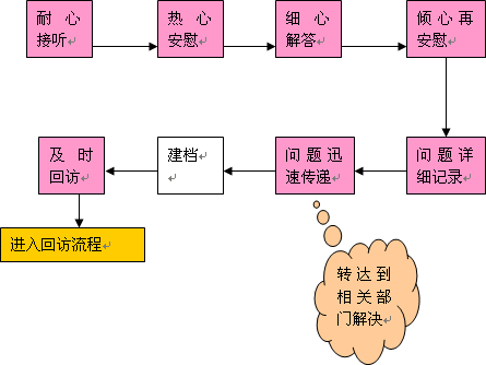 a、 呼叫中心在回訪、投訴應(yīng)答、咨詢應(yīng)答過程中存在的問題,應(yīng)當(dāng)及時的轉(zhuǎn)遞到相關(guān)的部門。