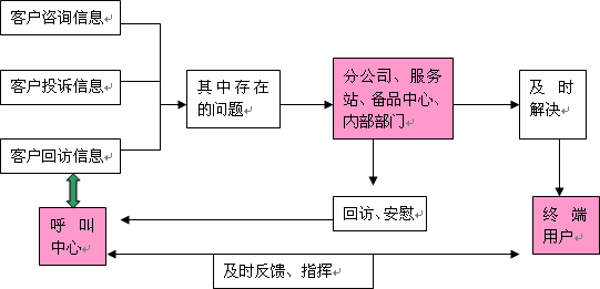呼叫中心的回訪呼叫工作、咨詢服務(wù)呼叫和問題投訴呼叫需要掌握大量的客戶信息資源和公司的產(chǎn)品與服務(wù)政策信息,而這方面的信息需要由客戶購車過程、維修過程和公司內(nèi)部的相關(guān)部門提供。