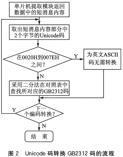 單片機(jī)通過串口與模塊連接后,發(fā)送讀取第一條新短消息指令:“AT+CMGR=1”。提取模塊接收的短消息后,先判斷其內(nèi)容是否為ASCII碼。若為ASCII碼,則無需轉(zhuǎn)換直接讀。环駝t,通過查表法查找其對(duì)應(yīng)的漢字GB碼,實(shí)現(xiàn)不同編碼間的轉(zhuǎn)換。轉(zhuǎn)換流程如圖2所示。
