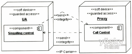 下面以基于SIP的兩方會話為例說明如何使用UMLsec描述業(yè)務安全需求。假定兩方呼叫發(fā)生在同一SIPProxy轄域的兩個用戶之間,要求保證用戶UA與SIPProxy之間的信令的完整性,不能被非法入侵者篡改。該場景的用例圖和部署圖分別如圖2、圖3所示。