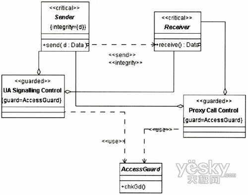 圖3中的UA代表UserA或UserB的UA,因為兩個UA的信令交互需要通過Proxy,且其安全需求是一致的,故在圖中只表現(xiàn)出一方。UA和Proxy均是基于通用計算平臺的節(jié)點,其訪問控制需要受到保護,故對其標記上定型《guardedaccess》。UA中除處理信令外,還需處理媒體流的編解碼與控制,這個用例中只涉及信令的安全性,故在UA中只關(guān)注進行信令控制的組件。UA與Proxy之間的通信基于IP承載,根據(jù)表1定義的威脅函數(shù):ThreatA(IP