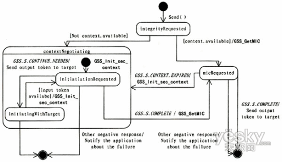 下面說明如何利用GSS-API實現(xiàn)保證通信完整性的安全能力抽象類,通過狀態(tài)圖說明保證通信完整性的Sender類的send()方法及Receiver類的receive()方法的GSS-API實現(xiàn)。本文中給出的是一個示意性的說明,忽略了一些錯誤處理過程。