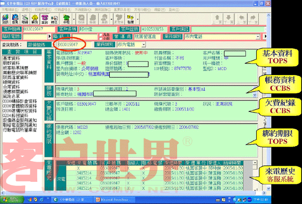 我們推動(dòng)「CPEP客服流程提升計(jì)劃」的重點(diǎn)是在IVR流程中就請客戶自行輸入其欲查詢或辦理的電話號碼,同時(shí)客服系統(tǒng)便先透過EAI到后端信息系統(tǒng),查詢出該號碼的核心數(shù)據(jù)(含基本、帳務(wù)、欠費(fèi)記錄、來電歷史等),當(dāng)客服人員應(yīng)答時(shí)客服系統(tǒng)便立即將這些核心數(shù)據(jù)顯示在屏幕上(如圖一),客服人員便可立即掌握此客戶之相關(guān)資料,CPEP如此改善后平均的服務(wù)效率提升了11%。