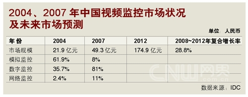 IDC的數(shù)字同樣樂觀。跟據(jù)IDC在2008年的預(yù)測,2008~2012年,中國視頻監(jiān)控市場的年均復(fù)合增長率將達(dá)28.8%,遠(yuǎn)高于IT市場投入的平均增長率。而在模擬、數(shù)字與IP模式(即網(wǎng)絡(luò)監(jiān)控)組成的視頻監(jiān)控市場里,IP的增長率又將高于前二者,成為市場增長的強勁動力。”(注:模擬監(jiān)控是指圖像信號在采集后,通過模擬信號傳輸?shù)姆忾]式視頻監(jiān)控系統(tǒng)模式;數(shù)字監(jiān)控是指圖像信號在采集后,經(jīng)過編碼轉(zhuǎn)化成數(shù)字信號再進(jìn)行傳輸?shù)姆忾]或半封閉式視頻監(jiān)控系統(tǒng)模式;網(wǎng)絡(luò)監(jiān)控是指系統(tǒng)建立在以網(wǎng)絡(luò)為基礎(chǔ)的傳輸平臺的開放式視頻監(jiān)控系統(tǒng)模式)。