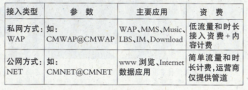 目前,運營商采用兩種接入方式(WAP和NET)接入移動互聯(lián)網(wǎng),如表所示: