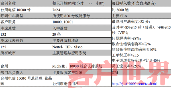 中國(guó)電信臺(tái)州市的10000客服中心,擁有100多名員工,承擔(dān)該市電信公司對(duì)外的所有客戶服務(wù)工作。中心先后被浙江省電信工會(huì)授予“先進(jìn)女職工集體”,浙江省電信分公司授予“學(xué)習(xí)型示范班組”、“創(chuàng)建學(xué)習(xí)型組織先進(jìn)班組(團(tuán)隊(duì))”,并獲得了“集團(tuán)公司優(yōu)秀10000號(hào)服務(wù)團(tuán)隊(duì)”,同時(shí)被中華全國(guó)總工會(huì)、信息產(chǎn)業(yè)部、共青團(tuán)中央授予“全國(guó)先進(jìn)女職工集體”以及“全國(guó)青年文明號(hào)”的稱號(hào),連續(xù)兩年被信息產(chǎn)業(yè)部評(píng)定為“全國(guó)用戶滿意電信服務(wù)明星班組”。