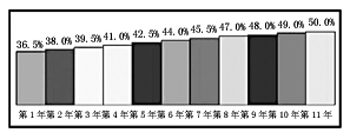 除了分檔包月的語音套餐,KDDI還根據(jù)消費(fèi)者的不同需求提供了多樣折扣優(yōu)惠,其中包括在網(wǎng)時(shí)長(zhǎng)優(yōu)惠、家庭優(yōu)惠、個(gè)人優(yōu)惠、學(xué)生優(yōu)惠等多種方式(圖1)。多樣優(yōu)惠折扣方式之間也可以通過組合產(chǎn)生新的優(yōu)惠折扣內(nèi)容。例如:在網(wǎng)時(shí)長(zhǎng)優(yōu)惠與家庭優(yōu)惠共享的套餐在入網(wǎng)的第1年優(yōu)惠折扣達(dá)到40%,此后每續(xù)約1年將增加1%的折扣優(yōu)惠,逐年累積下來,在第11年將享受高達(dá)50%的優(yōu)惠折扣(圖2)。時(shí)段優(yōu)惠套餐中體現(xiàn)分時(shí)段優(yōu)惠,區(qū)分忙時(shí)、閑時(shí),周末時(shí)間和工作時(shí)間,分別定價(jià)。例如,同樣是9500日元的套餐檔次,在時(shí)段優(yōu)惠套餐中,周末白天(閑時(shí))的資費(fèi)是每分鐘10日元,而在非時(shí)段優(yōu)惠的普通套餐中,每分鐘的資費(fèi)是24日元,可見在網(wǎng)絡(luò)閑時(shí)可以享受更多的資費(fèi)優(yōu)惠。而針對(duì)學(xué)生和老人設(shè)計(jì)的套餐也能享受比普通套餐更優(yōu)惠的資費(fèi),這就體現(xiàn)了區(qū)別細(xì)分市場(chǎng)的差異化定價(jià)。