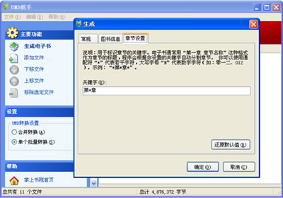 對(duì)于單個(gè)批量轉(zhuǎn)換的用戶而言,UMD舵手擁有智能斷章功能,完美解決了TXT電子書在手機(jī)上無法分章的難題。在“章節(jié)設(shè)置”選項(xiàng)卡中輸入用于制作章節(jié)目錄的關(guān)鍵字。例如:1、“第一章華山論劍”,則輸入的關(guān)鍵字可為:“第*章”;“一、華山論劍”,則輸入的關(guān)鍵字可為:“N、”;“【華山論劍】”,則輸入的關(guān)鍵字可為:“【*】”;“1-3-5節(jié):華山論劍”,則輸入關(guān)鍵字可為:“N-N-N 節(jié):”。