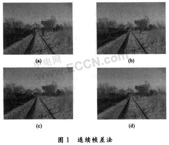 綜合考慮以上四種背景提取方法,本文采用結(jié)合多幀圖像平均法和連續(xù)幀差法這兩種方法來進(jìn)行視頻序列背景的提取?紤]到運(yùn)動(dòng)目標(biāo)的多樣性,有目標(biāo)經(jīng)過視場而引起的變化長時(shí)間內(nèi)可忽略不計(jì)。多幀圖像平均法時(shí)將運(yùn)動(dòng)目標(biāo)看作為噪聲,用累加平均的方法消除噪聲,利用目標(biāo)運(yùn)行一段時(shí)間的序列圖像進(jìn)行平均而得到視場背景圖像。連續(xù)幀差算法是通過當(dāng)前幀的圖像與前一幀圖像的差值找到運(yùn)動(dòng)區(qū)域,對(duì)運(yùn)動(dòng)區(qū)域的背景保持不變,而非運(yùn)動(dòng)區(qū)域的背景則用當(dāng)前幀進(jìn)行更新,經(jīng)過一段時(shí)間的迭代便可提取出背景。兩種方法的結(jié)合可以很好地彌補(bǔ)各自的缺點(diǎn),能夠適應(yīng)鐵路沿線周邊環(huán)境的要求,對(duì)存在運(yùn)動(dòng)目標(biāo)的背景能夠提取出質(zhì)量較高的背景圖像。具體過程如下: