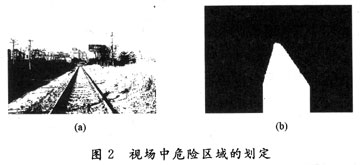 圖像二值化后的結(jié)果如圖2(a)所示,得到的最終結(jié)果如圖2(b)所示。從兩幅圖像的對(duì)比可以看出,圖像經(jīng)過一系列處理后,基本標(biāo)定了危險(xiǎn)區(qū)域。對(duì)于得到的圖2(b),圖中白色的區(qū)域?yàn)殍F道雙軌內(nèi)部即設(shè)定的危險(xiǎn)區(qū)域。應(yīng)用此種方法得到的結(jié)果圖像在光照條件充足情況下能夠得到更好的效果,不適用于光照條件不足和夜間的危險(xiǎn)區(qū)域標(biāo)定。