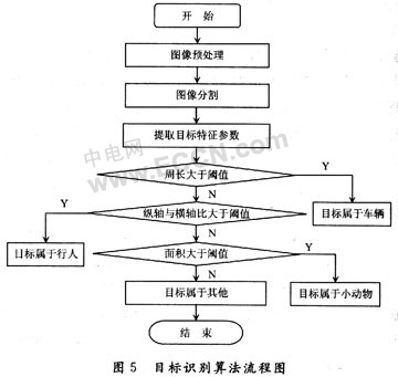 根據(jù)運(yùn)動(dòng)目標(biāo)的分類可知,車輛的周長是最長的,所以首先直接判斷圖像中運(yùn)動(dòng)目標(biāo)的周長,如果大于某一設(shè)定好的閾值,則可輕易判斷出視場中目標(biāo)屬于車輛。余下的目標(biāo)中,行人比小動(dòng)物的縱橫軸比值大,設(shè)定縱橫軸比閾值,據(jù)此可以判斷出目標(biāo)屬于行人。最后將設(shè)定一個(gè)面積閾值,面積大于此閾值則可判斷目標(biāo)屬于小動(dòng)物,否則目標(biāo)屬于其他一些環(huán)境的干擾。