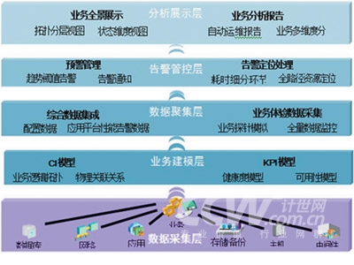 數(shù)據(jù)聚集層: 在這一層,系統(tǒng)將經(jīng)過CI/KPI模型、按不同業(yè)務(wù)規(guī)則結(jié)構(gòu)化之后的三類用戶體驗(yàn)數(shù)據(jù)進(jìn)行匯聚:業(yè)務(wù)監(jiān)控?cái)?shù)據(jù)(業(yè)務(wù)可用性、業(yè)務(wù)量、業(yè)務(wù)辦理時(shí)長、業(yè)務(wù)的后臺(tái)服務(wù)器負(fù)載情況等)、配置數(shù)據(jù)(從CMDB中定時(shí)同步配置項(xiàng)信息和配置關(guān)聯(lián)信息),業(yè)務(wù)感性數(shù)據(jù)(業(yè)務(wù)量、積壓量和投訴等信息),使得運(yùn)維人員不僅能夠從IT支撐視角掌握業(yè)務(wù)運(yùn)行狀況,還能直觀了解到在當(dāng)前業(yè)務(wù)運(yùn)行情況之下客戶層面的使用感知。