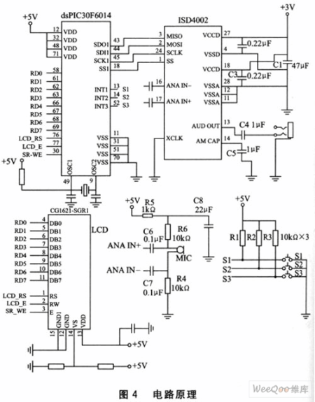 本電路采用dsPICC30F6014數(shù)字信號控制器,通過3個按鍵開關(guān)控制ISD4002錄放音芯片的動作。S1、S2、S3分別接到控制器外部中斷INTl、INT2、INT3上。當按下S1時,開始錄音,再次按下S1時停止錄音。如此反復即可實現(xiàn)多段錄音。同理,按下S2時開始放音,再次按下S2是停止放音。如此反復順序播放多段錄音。按下S3關(guān)機。