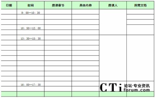 表格內(nèi)容包括:培訓(xùn)日期、時間、授課內(nèi)容、授課人員、所需文檔等。