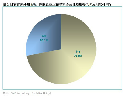 28.1%目前還沒有使用IVR系統(tǒng)的公司正在積極尋求語音自助服務(wù)解決方案來幫助自己達(dá)成目標(biāo),這一數(shù)字高得頗讓人驚訝。見圖2。經(jīng)濟(jì)衰退促使那些曾經(jīng)對使用自助服務(wù)技術(shù)猶豫不決的企業(yè)下定決心投資購買此類解決方案。一個具有正確規(guī)劃、設(shè)計和投放過程的IVR系統(tǒng)能夠?qū)⑷斯ご硖幚淼碾娫捔拷档?0%到90% (長期來說),具體數(shù)字有賴于聯(lián)絡(luò)中心的目的以及編入解決方案內(nèi)部的任務(wù)。IVR用戶的增長勢頭有望在經(jīng)濟(jì)形勢好轉(zhuǎn)之后仍然延續(xù)下去。一個經(jīng)過良好設(shè)計并成功實施的IVR方案所帶來的利益和節(jié)約的成本是即便最不情愿使用它的經(jīng)理都不得不承認(rèn)的。