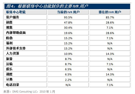 圖4根據(jù)職能對現(xiàn)有和潛在的主要IVR用戶進(jìn)行了區(qū)分?蛻舴⻊(wù)和銷售聯(lián)絡(luò)中心是最上層的IVR用戶,分別占現(xiàn)有用戶量的93.5%和47.8%,占潛在用戶量的85.7%和28.6%。
