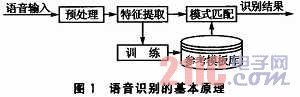 語音識別的基本原理如圖1所示。語音識別包括兩個(gè)階段:訓(xùn)練和識別。不管是訓(xùn)練還是識別,都必須對輸入語音預(yù)處理和特征提取。訓(xùn)練階段所做的具體工作是通過用戶輸入若干次訓(xùn)練語音,經(jīng)過預(yù)處理和特征提取后得到特征矢量參數(shù),最后通過特征建模達(dá)到建立訓(xùn)練語音的參考模型庫的目的。而識別階段所做的主要工作是將輸入語音的特征矢量參數(shù)和參考模型庫中的參考模型進(jìn)行相似性度量比較,然后把相似性最高的輸入特征矢量作為識別結(jié)果輸出。這樣,最終就達(dá)到了語音識別的目的。
