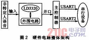 如圖2所示,硬件電路主要包括主控核心部分和語音識別部分。語音進(jìn)入語音識別部分后,將處理過的數(shù)據(jù)并行傳輸?shù)街骺刂破,主控制器?jīng)過處理后,發(fā)送命令數(shù)據(jù)到USART,USART可用于擴(kuò)展外圍串行設(shè)備,如語音合成模塊等。
