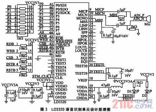圖3為語音識別部分原理圖,參照了ICRoute發(fā)布的LD3320數(shù)據(jù)手冊進(jìn)行設(shè)計(jì)。LD3320的內(nèi)部集成了快速穩(wěn)定的優(yōu)化算法,不需外接Fla-sh、RAM,不需要用戶事先訓(xùn)練和錄音而完成非特定人語音識別,識別準(zhǔn)確率高。
