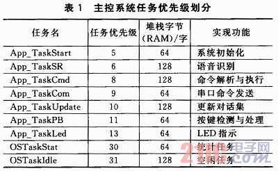 表1中除OSTaskStat和OSTaskIdle任務(wù)為系統(tǒng)自帶,其他7個(gè)任務(wù)均為用戶創(chuàng)建。App_TaskStart是系統(tǒng)的第一個(gè)任務(wù),對系統(tǒng)時(shí)鐘和底層設(shè)備進(jìn)行初始化,創(chuàng)建所有事件和其他各項(xiàng)用戶任務(wù),并對系統(tǒng)狀態(tài)進(jìn)行監(jiān)測;App_TaskSR完成語音識別;App_TaskCmd完成對話集中命令的解析和執(zhí)行,并通過USART1向外發(fā)送;App_TaskCom作為外圍擴(kuò)展任務(wù),通過USART2向外發(fā)送指令或數(shù)據(jù),負(fù)責(zé)控制外圍擴(kuò)展設(shè)備,如語音合成設(shè)備等;